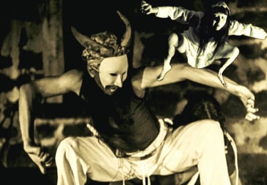 舞踏及宮廷面具舞,同根於東亞的身體哲學/信念/大地養分,兩者巧合地對於眾生、生死、動物、大自然、靈性有著同樣的尊重及身體詩意/想像/轉化的連結。意識成就非意識,陰陽能量調衡剛柔,肌肉跟小關節的拆解或亂序,兩個舞種同樣強調自呼吸、觀照的中性狀態中尋找非理性的表達異象或空間敏銳度。